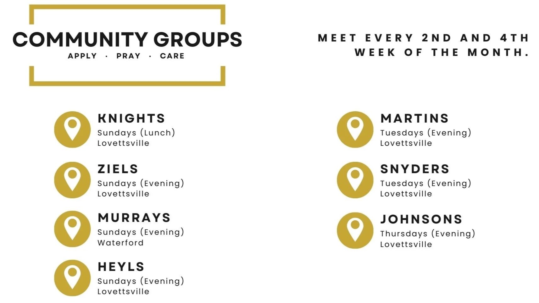Community Groups exist to cultivate gospel application and gospel community. They help us regularly connect with other believers to be strengthened, challenged, and refreshed in ways we couldn’t be on our own. Groups meet on the 2nd & 4th weeks of the month. If you’re interested in visiting a group, fill out the form to get connected.